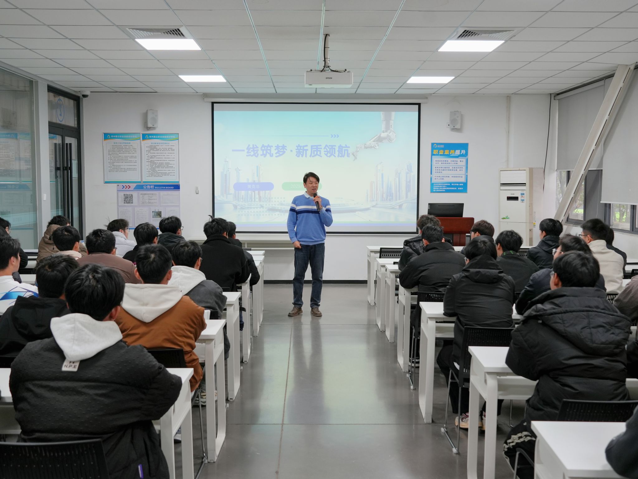仪式后,一场别开生面的“移动思政课”在现场展开。马克思主义学院教师以“一线筑梦 新质领航”为主题,围绕 “时代之问:为何必须推动产业升级”“新质生产力与高质量发展”“青年的使命坐标”三个层次,引导学生从国际国内形势中理解产业变革的紧迫性,从国家战略中认识“新质生产力”的深刻内涵,并鼓励学生沉心静气、扎根一线,让青春在推动制造业升级中闪耀价值。这堂思政课将思想引领嵌入企业场景,实现了专业教育、职业精神培育与价值观塑造的有机融合,为学生奠定了坚实的思想根基。
