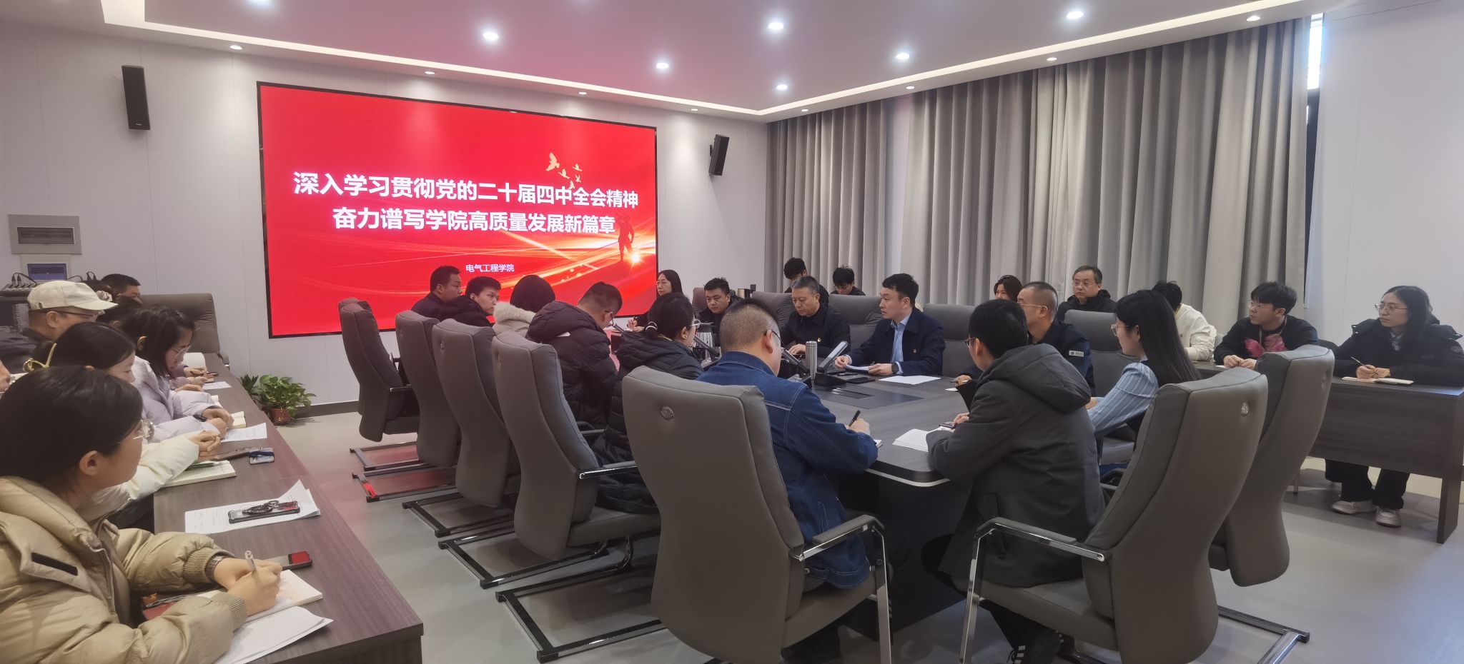 为深入学习贯彻党的二十届四中全会精神,进一步统一思想、凝聚共识,自觉将全会精神转化为推动工作的根本遵循和强大动力,近日,电气工程学院党总支组织开展集中学习,学校党委委员、纪委书记、工会主席张忠良同志,学院全体党员及入党积极分子参加了学习。